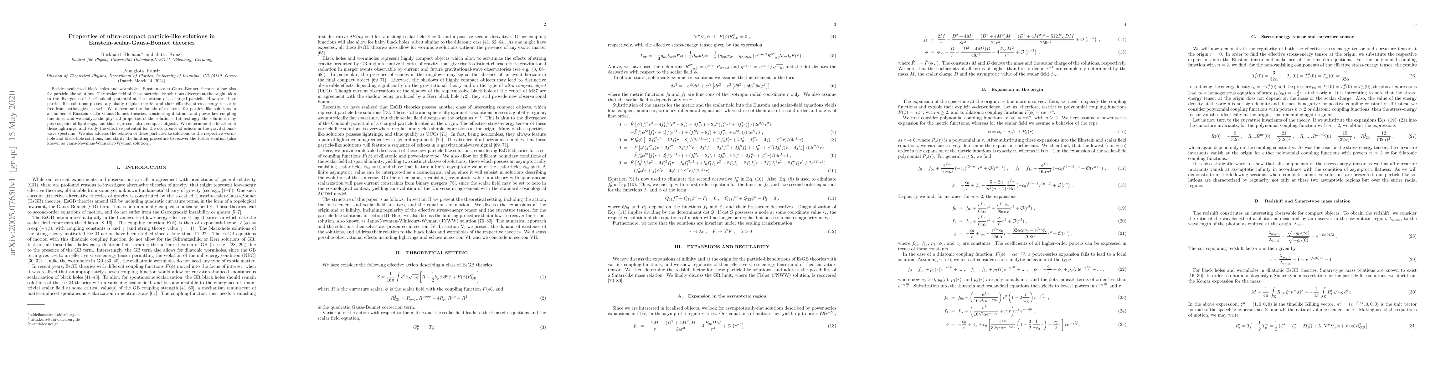 This paper explores ultra-compact particle-like solutions in Einstein-scalar-Gauss-Bonnet theories, revealing their globally regular metrics and effective stress-energy tensors. It investigates the existence domain and physical properties, including the potential for lightrings and gravitational-wave echoes, and relates these to wormhole and black-hole solutions.