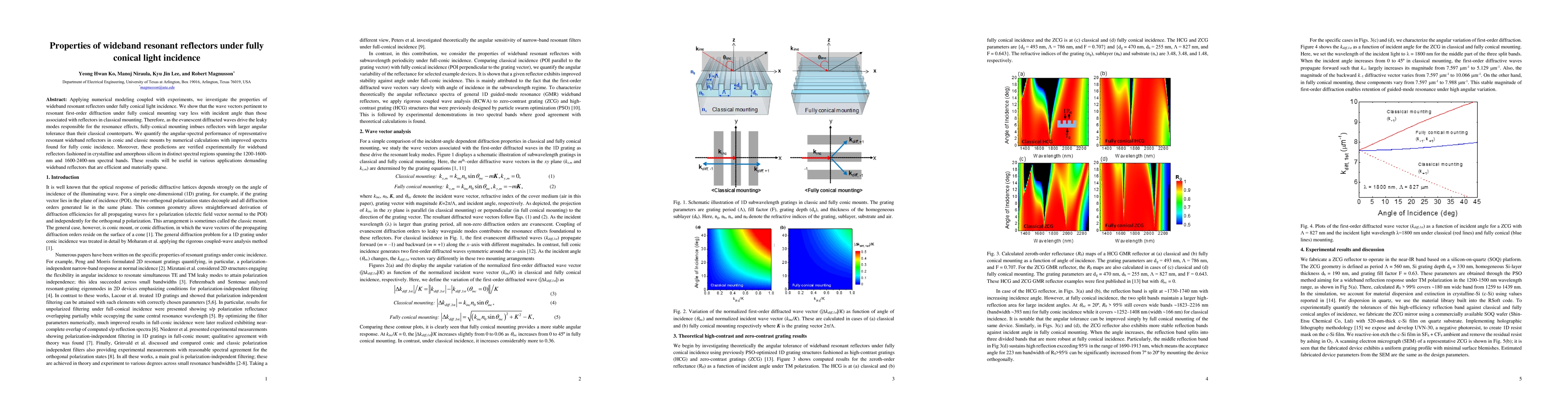 This research examines wideband resonant reflectors under fully conical light incidence, demonstrating via numerical modeling and experiments that such reflectors exhibit larger angular tolerance compared to classical mounting due to less variation in wave vectors for resonant diffraction. The findings, validated experimentally across silicon materials, suggest enhanced performance for wideband reflector applications.