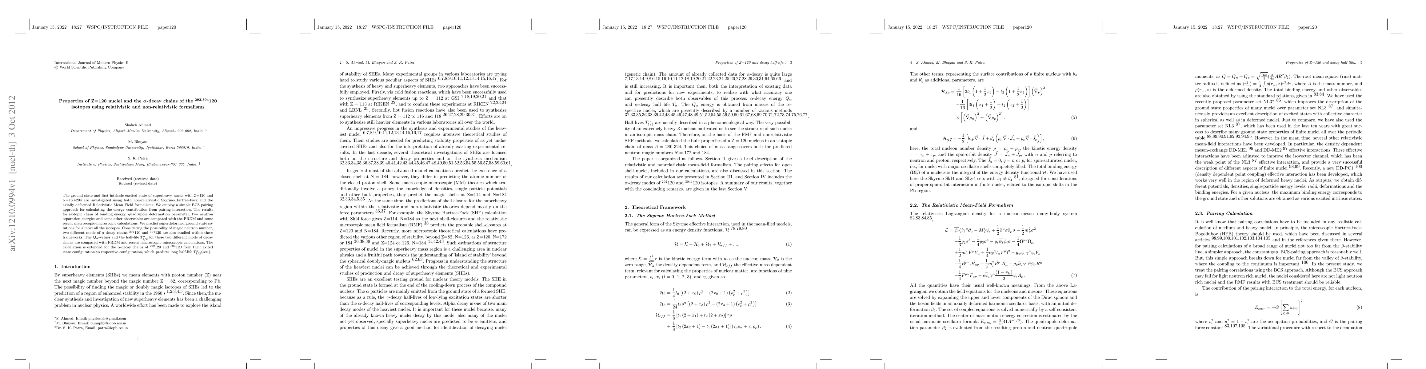 This paper investigates the properties of Z=120 superheavy nuclei using both non-relativistic and relativistic formalisms, predicting superdeformed ground states and analyzing alpha-decay chains for isotopes (292,304)120. Comparisons with other theoretical models reveal long half-lives for alpha decay.