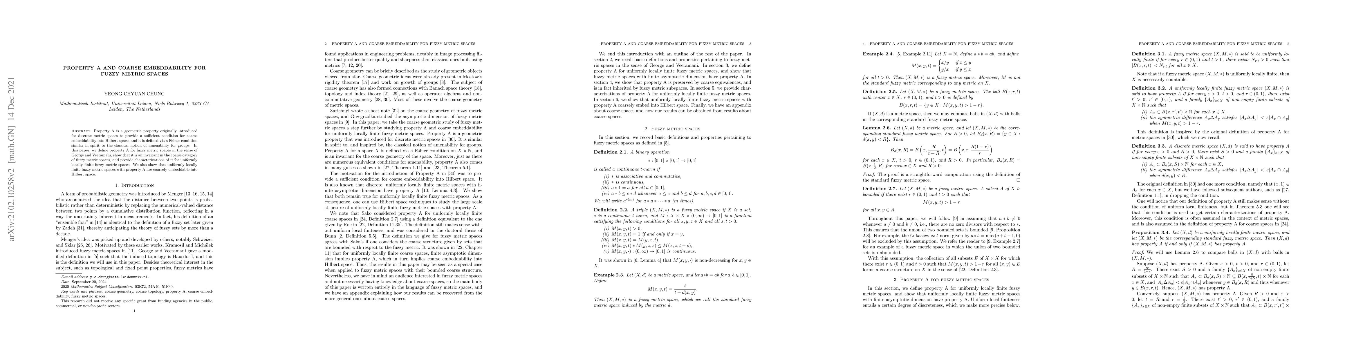 Researchers introduced Property A for fuzzy metric spaces, showing it's an invariant in coarse category theory and sufficient for coarse embeddability into Hilbert space.