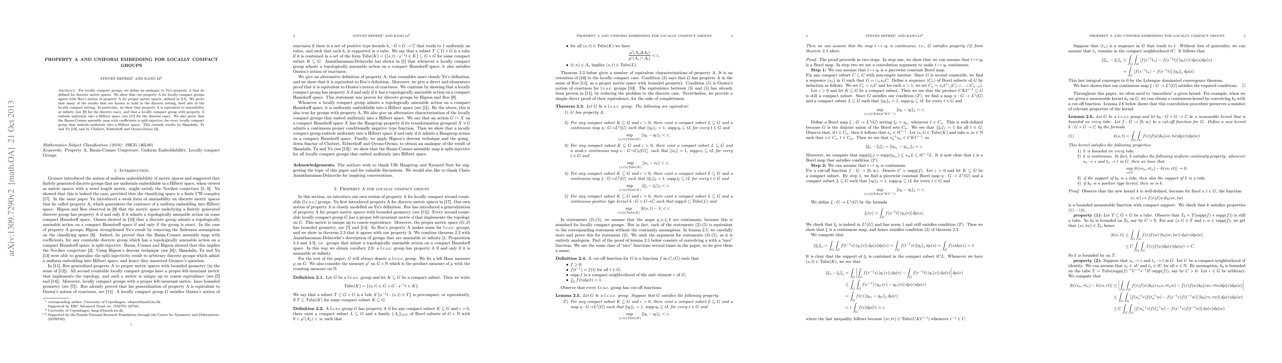 This paper defines an analogue of Yu's property A for locally compact groups and shows it aligns with Roe's property A for proper metric spaces. It proves that property A implies amenability at infinity and uniform embedding into Hilbert spaces, extending known results from the discrete setting.