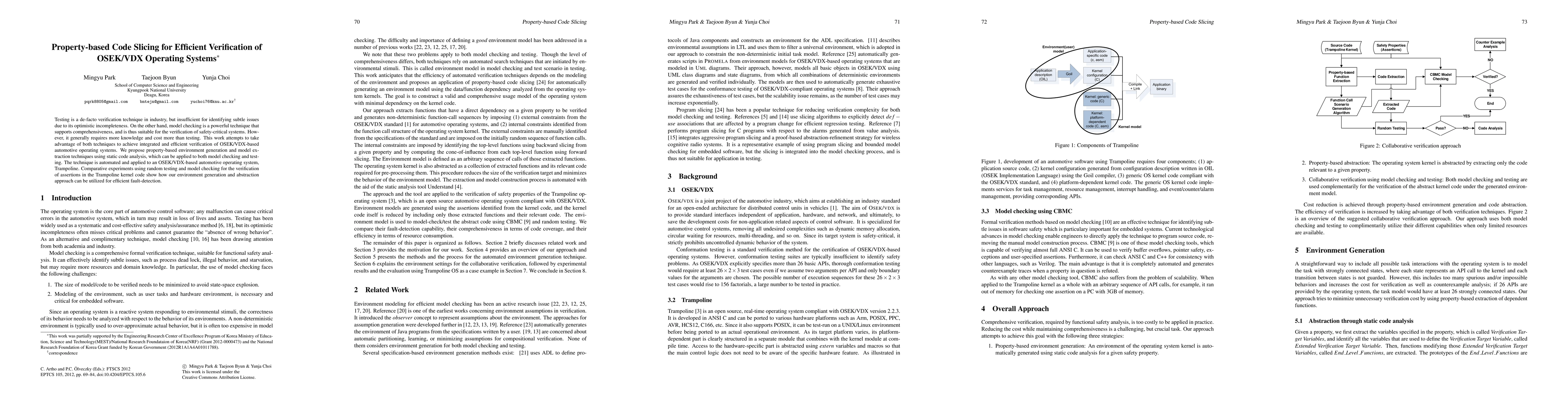 This paper proposes a method combining property-based code slicing and environment generation to enhance the verification of OSEK/VDX-based automotive operating systems. It leverages static code analysis for automated model checking and testing, demonstrating improved efficiency and fault-detection in the Trampoline kernel code.