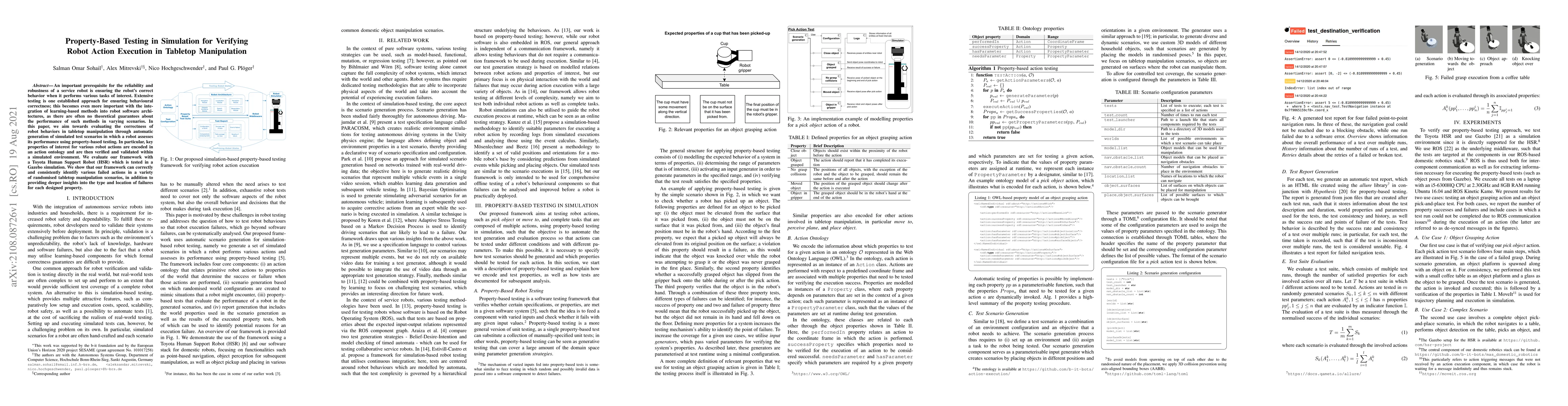 This paper proposes a framework for verifying robot behaviors in tabletop manipulation using property-based testing in simulation. The authors encode key properties in an action ontology and validate them in a Gazebo simulation with a Toyota HSR, demonstrating the framework's ability to identify and analyze various failed actions.