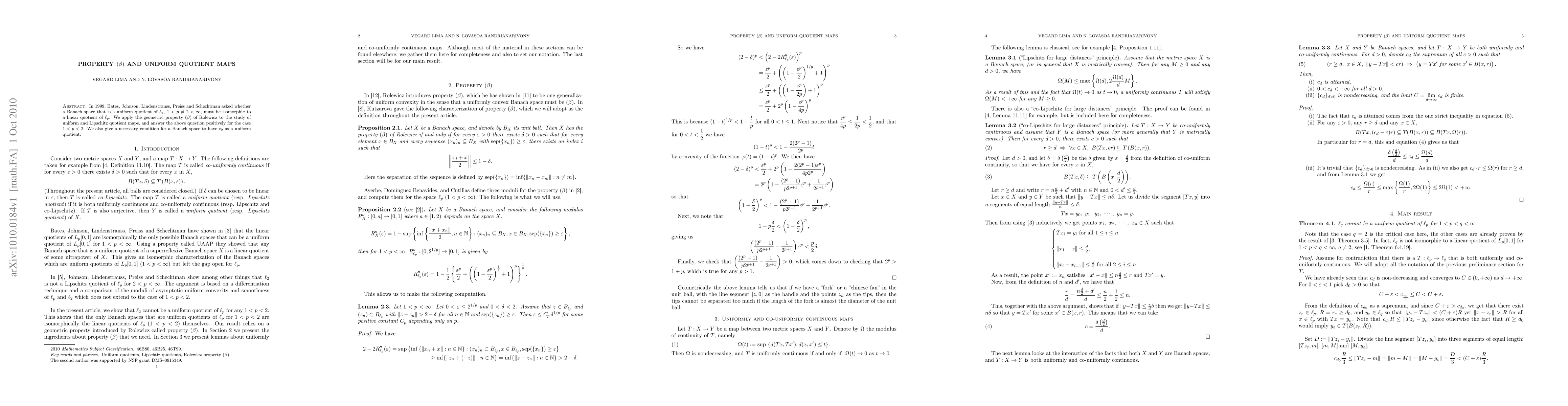 This paper confirms that Banach spaces uniformly quotient from $\ell_p$ for $1 < p < 2$ are isomorphic to linear quotients of $\ell_p$, using the geometric property $(\beta)$. It also provides a necessary condition for a Banach space to have $c_0$ as a uniform quotient.