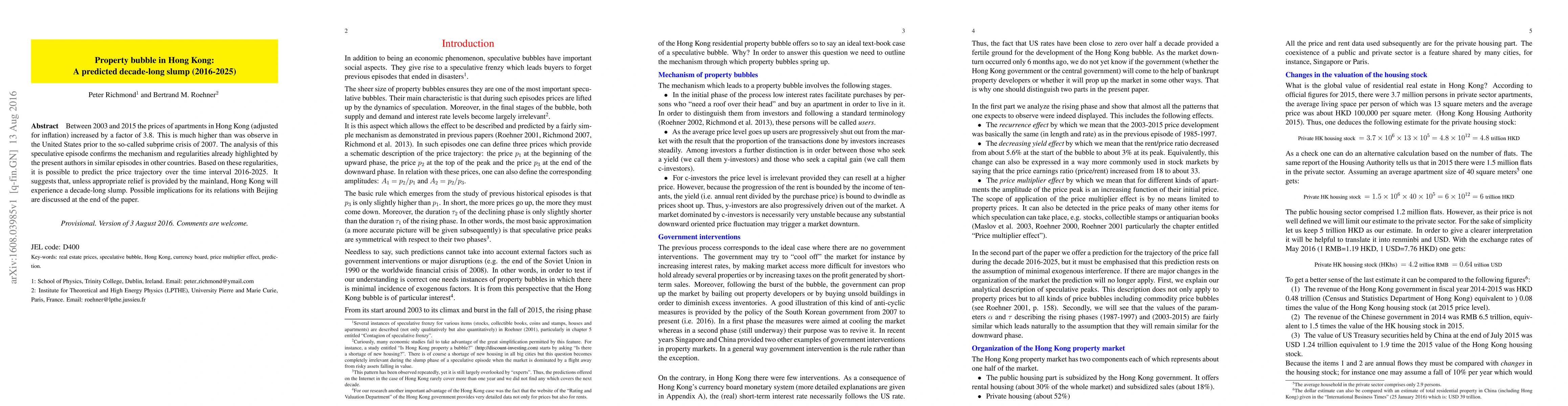 This paper analyzes the dramatic rise in Hong Kong's apartment prices from 2003 to 2015, predicting a decade-long slump from 2016 to 2025 unless relief measures are taken. It discusses potential implications for Hong Kong's relations with Beijing.