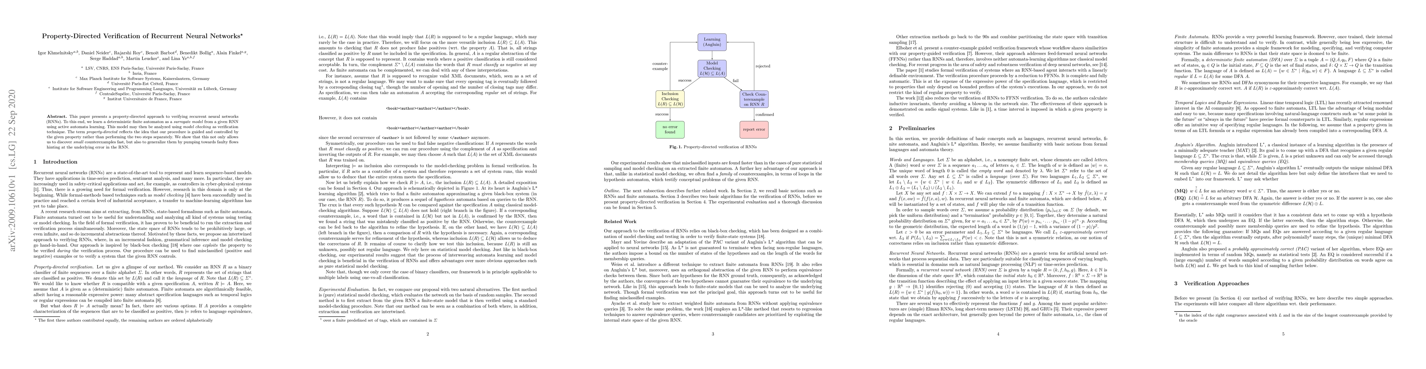 This paper proposes a property-directed verification method for recurrent neural networks (RNNs) using a deterministic finite automaton as a surrogate model. The approach combines active automata learning with model checking to efficiently discover and generalize counterexamples, highlighting errors in the RNN.