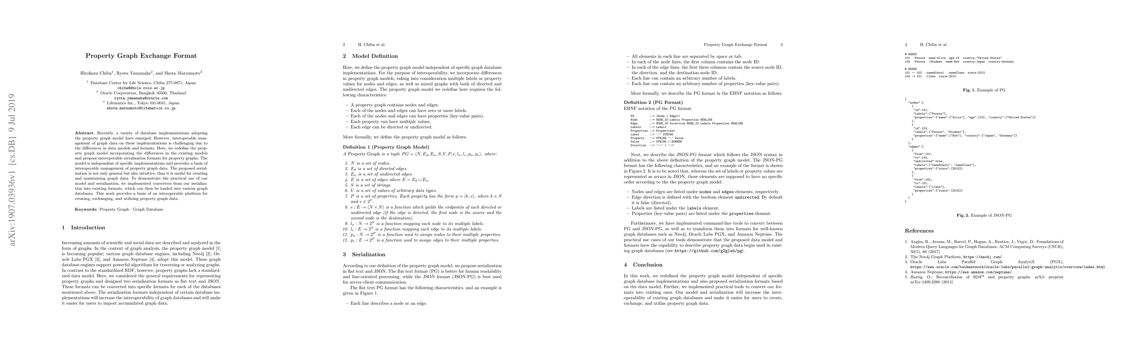 Recently, a variety of database implementations adopting the property graph model have emerged. However, interoperable management of graph data on these implementations is challenging due to the differences in data models and formats. Here, we redefine the property graph model incorporating the differences in the existing models and propose interoperable serialization formats for property graphs. The model is independent of specific implementations and provides a basis of interoperable management of property graph data. The proposed serialization is not only general but also intuitive, thus it is useful for creating and maintaining graph data. To demonstrate the practical use of our model and serialization, we implemented converters from our serialization into existing formats, which can then be loaded into various graph databases. This work provides a basis of an interoperable platform for creating, exchanging, and utilizing property graph data.