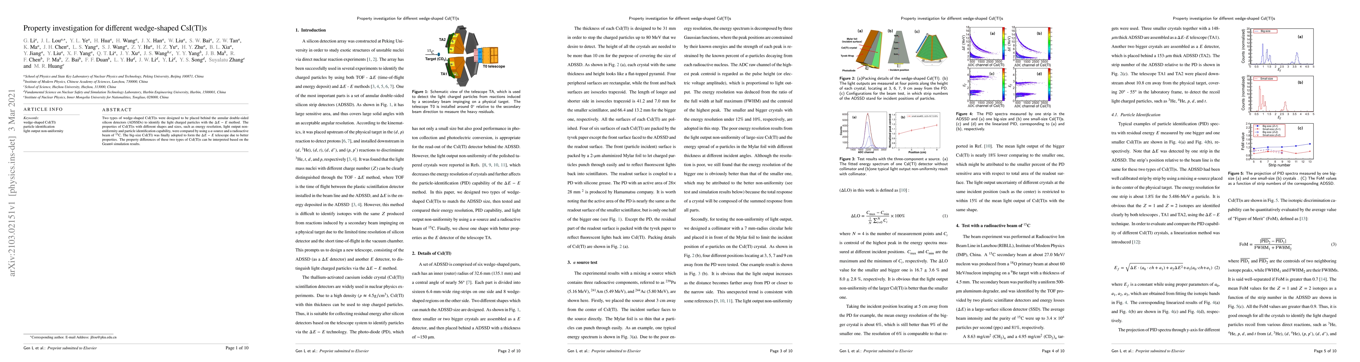 Two types of wedge-shaped CsI(Tl)s were designed to be placed behind the annular double-sided silicon detectors (ADSSDs) to identify the light charged particles with the $\Delta E-E$ method. The properties of CsI(Tl)s with different shapes and sizes, such as energy resolution, light output non-uniformity and particle identification capability, were compared by using a $\alpha$-source and a radioactive beam of $^{15}$C. The big-size CsI(Tl) was finally adopted to form the $\Delta E-E$ telescope due to better properties. The property differences of these two types of CsI(Tl)s can be interpreted based on the Geant4 simulation results.