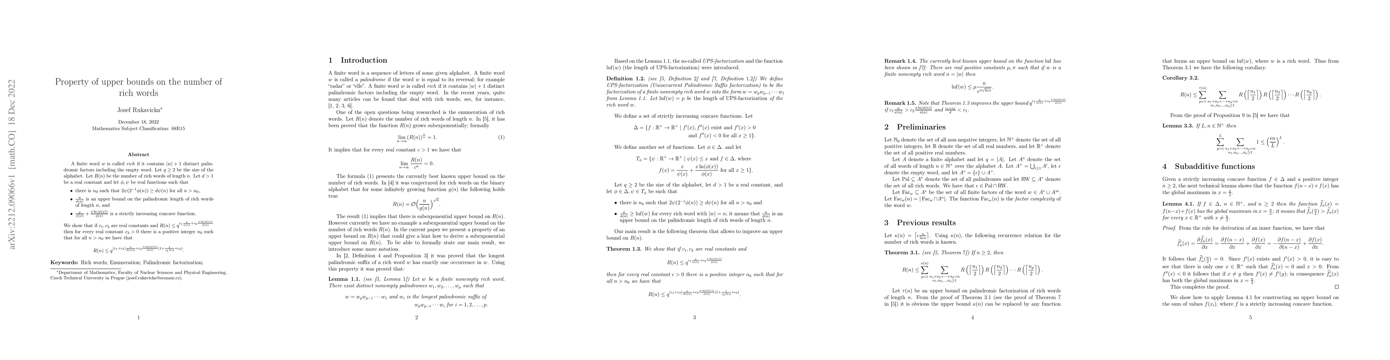 This paper investigates the properties of upper bounds for the number of rich words, defined as words containing $\vert w\vert+1$ distinct palindromic factors. It establishes a refined upper bound for $R(n)$, the number of rich words of length $n$, under certain conditions on the functions $\phi$ and $\psi$.