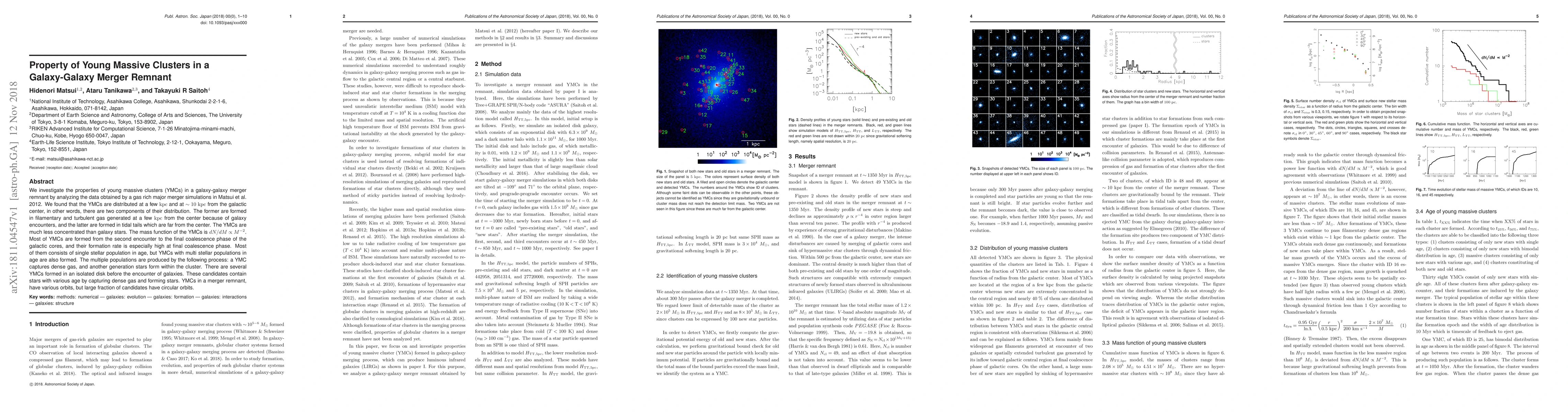 The study analyzes young massive clusters (YMCs) in a galaxy-galaxy merger using simulation data from Matsui et al. 2012. It reveals YMCs are distributed in two components - closer to the galactic center formed from filamentary gas due to galaxy encounters, and farther in tidal tails. YMC formation peaks during the final coalescence phase, with most being single-population, though some multi-population YMCs form via subsequent star generation within the cluster. Many YMCs have circular orbits, with some originating in an isolated disk before the galaxy encounter.