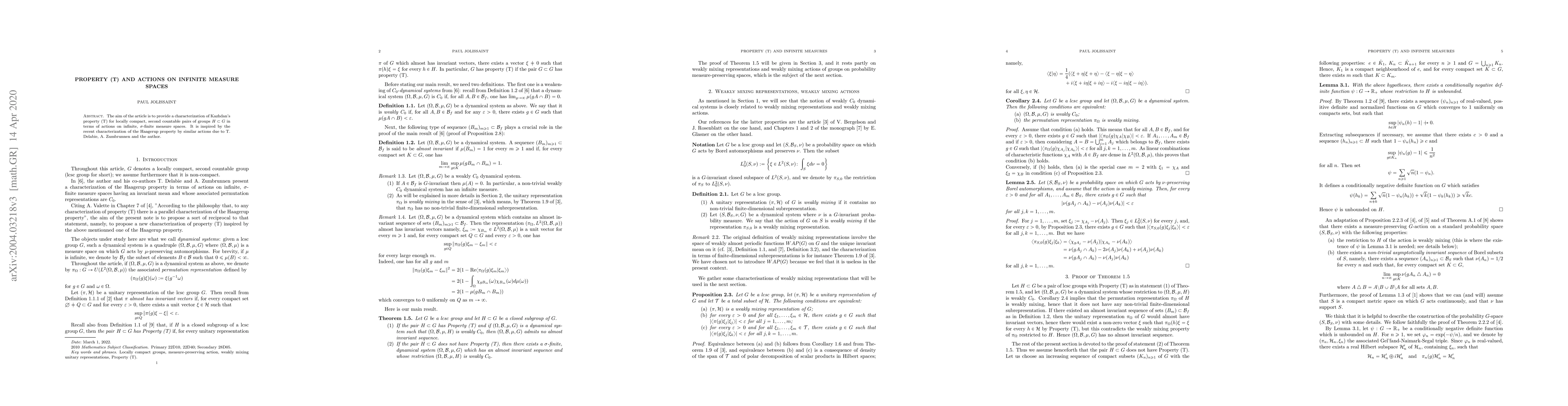 This paper characterizes Kazhdan's property (T) for group pairs $H\subset G$ through their actions on infinite, $\sigma$-finite measure spaces, inspired by recent work on the Haagerup property. The findings extend understanding of property (T) in the context of measure-theoretic dynamics.
