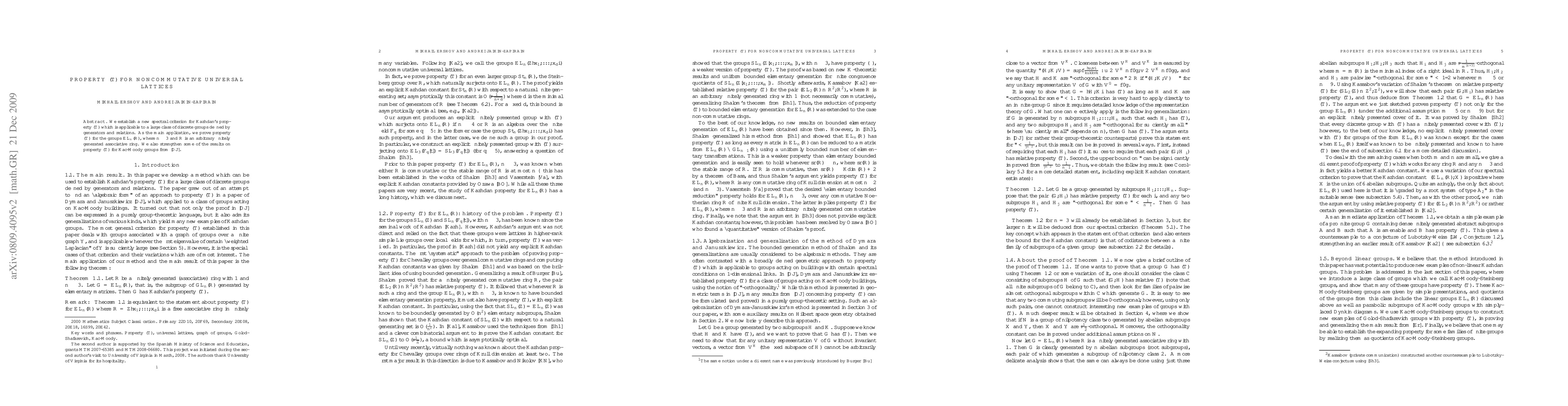 We establish a new spectral criterion for Kazhdan's property $(T)$ which is applicable to a large class of discrete groups defined by generators and relations. As the main application, we prove property $(T)$ for the groups $EL_n(R)$, where $n\geq 3$ and $R$ is an arbitrary finitely generated associative ring. We also strengthen some of the results on property $(T)$ for Kac-Moody groups from a paper of Dymara and Januszkiewicz (Invent. Math 150 (2002)).