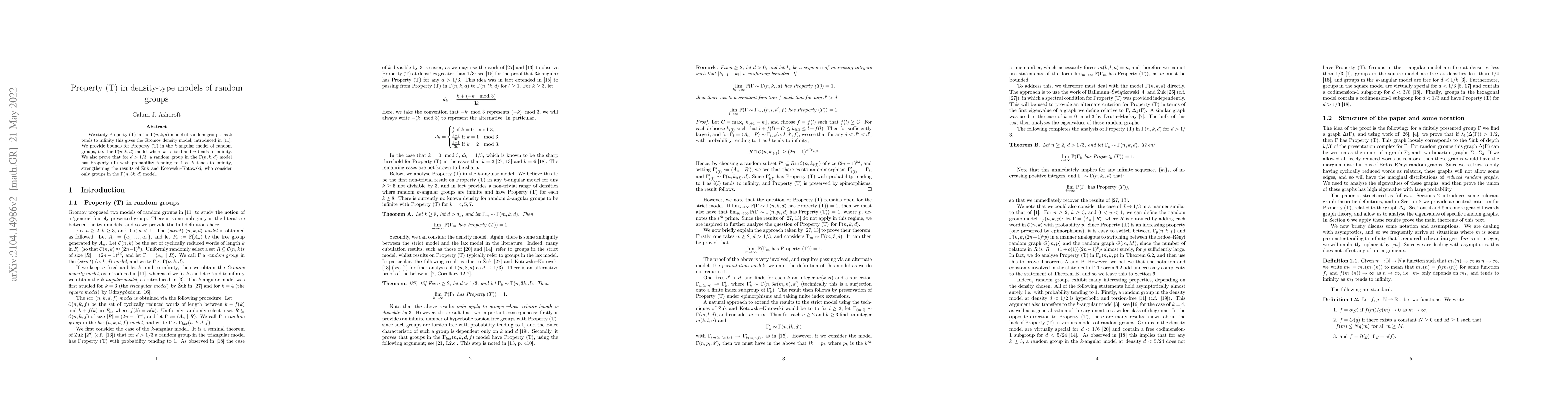 Researchers investigate Property (T) in random groups with varying densities, finding a probability of having Property (T) tending to 1 as k increases.