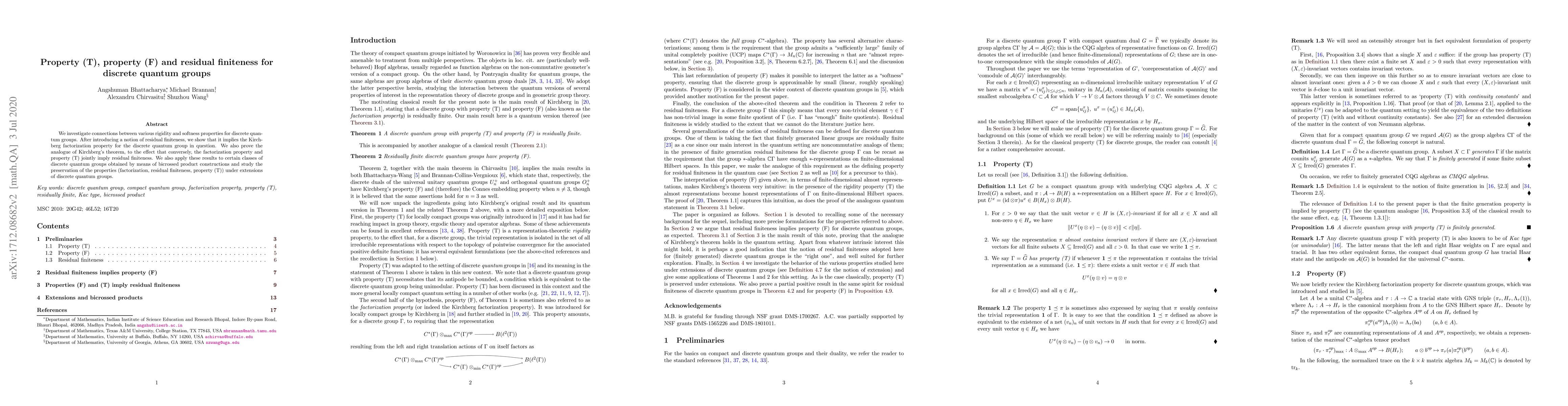 We investigate connections between various rigidity and softness properties for discrete quantum groups. After introducing a notion of residual finiteness, we show that it implies the Kirchberg factorization property for the discrete quantum group in question. We also prove the analogue of Kirchberg's theorem, to the effect that conversely, the factorization property and property (T) jointly imply residual finiteness. We also apply these results to certain classes of discrete quantum groups obtained by means of bicrossed product constructions and study the preservation of the properties (factorization, residual finiteness, property (T)) under extensions of discrete quantum groups.