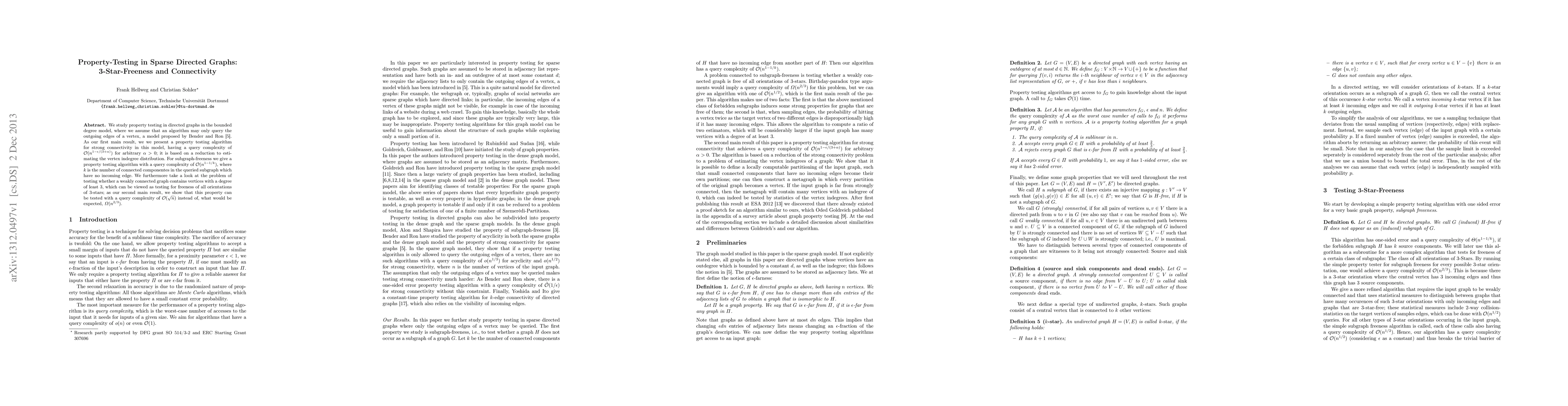 This paper presents property testing algorithms for strong connectivity and subgraph-freeness in sparse directed graphs with bounded degree. The algorithm for strong connectivity has a query complexity of $\mathcal{O}(n^{1-\epsilon/(3+\alpha)})$, while the algorithm for testing 3-star-freeness achieves a query complexity of $\mathcal{O}(\sqrt{n})$, significantly improving upon the expected $\Omega(n^{2/3})$.