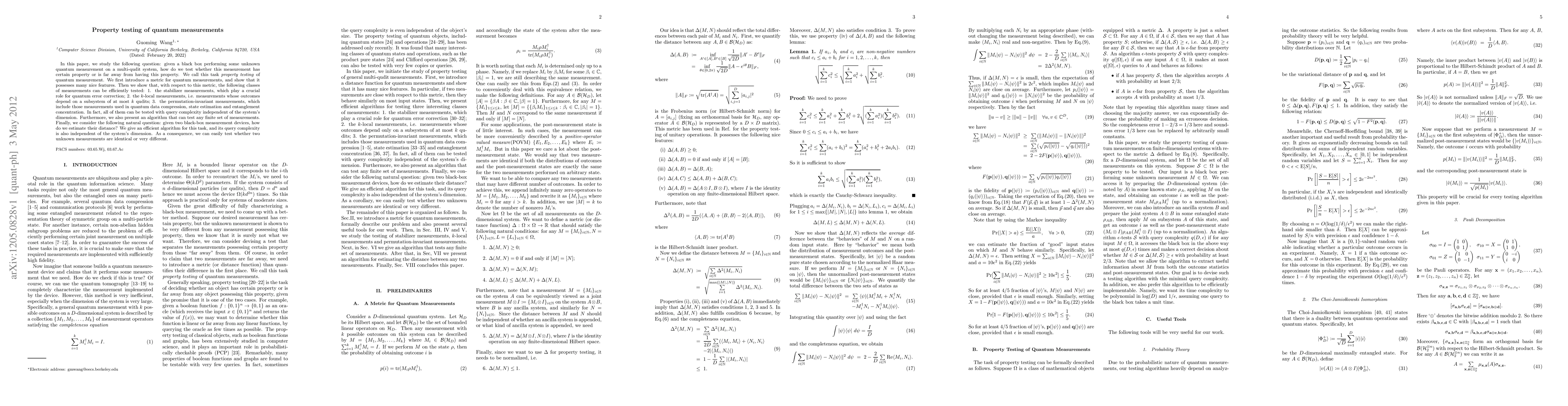 This paper introduces quantum measurement property testing, defining a suitable metric and demonstrating efficient testing for stabilizer, k-local, and permutation-invariant measurements, irrespective of system dimension. It also provides algorithms to test any finite set of measurements and estimate the distance between two unknown measurements, with query complexity independent of dimension.