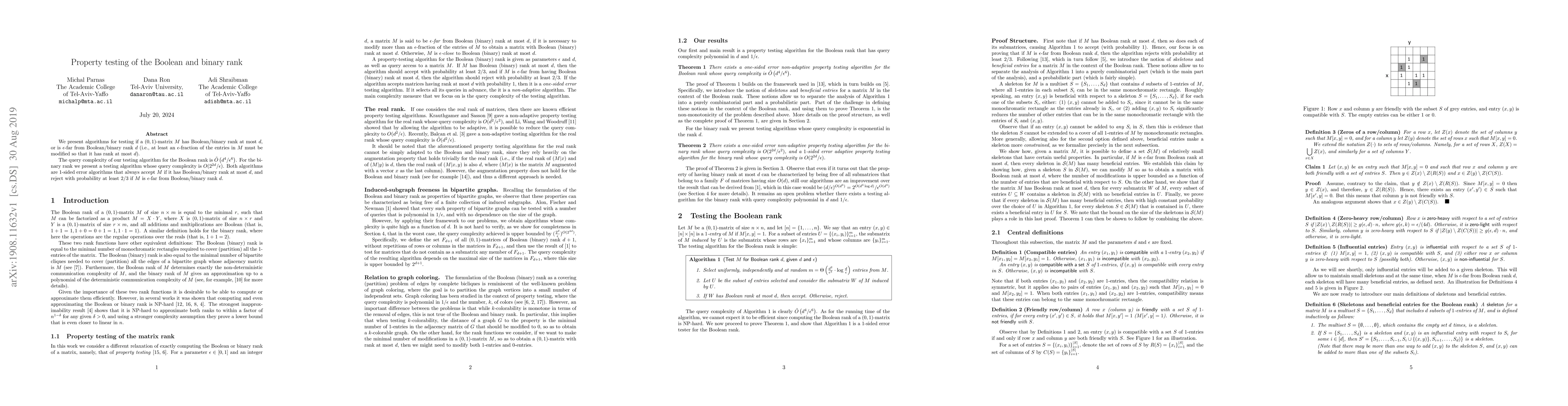 Researchers developed efficient algorithms to test if a matrix has low Boolean/binary rank, with query complexities of O(d^4/\u03bce^6) for Boolean and O(2^{2d}/\u03bce) for binary rank.