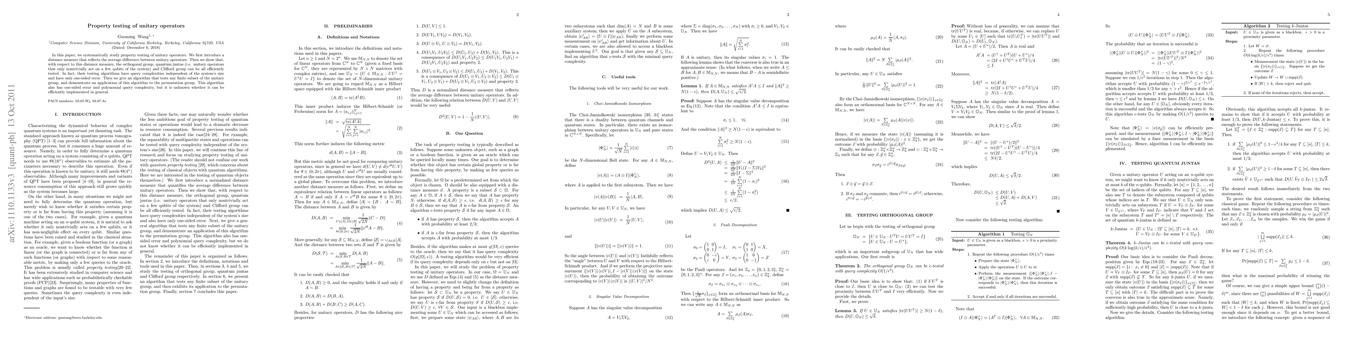 The paper systematically studies property testing of unitary operators, introducing a distance measure reflecting the average difference between unitary operators and demonstrating efficient testing algorithms for the orthogonal group, quantum juntas, and Clifford group with query complexities independent of the system's size and one-sided error.