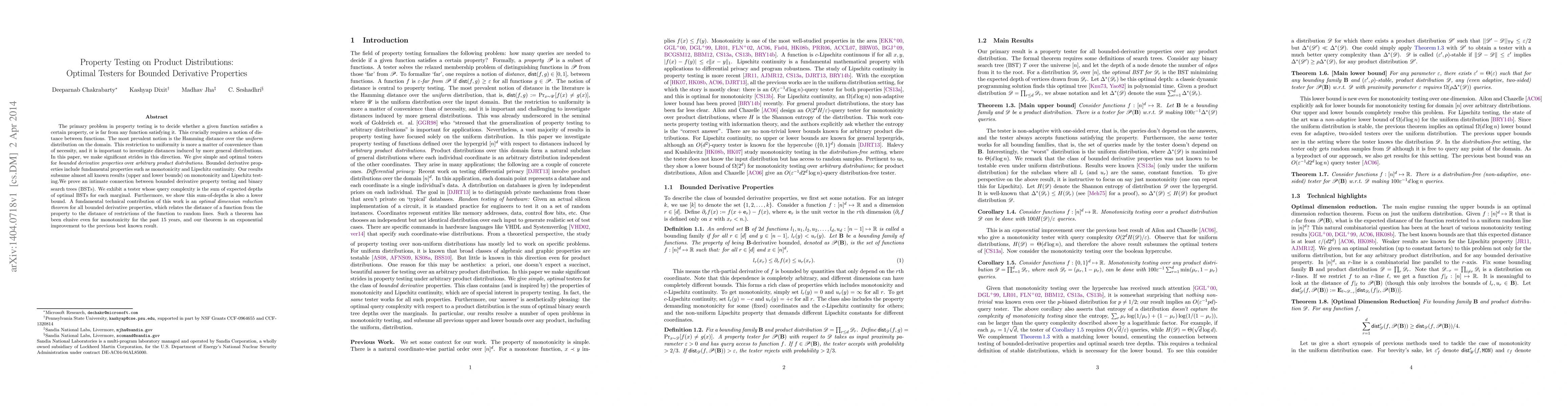 This paper presents optimal testers for bounded derivative properties, such as monotonicity and Lipschitz continuity, under arbitrary product distributions. It establishes a connection between these properties and binary search trees, and introduces an optimal dimension reduction theorem, significantly improving previous results.