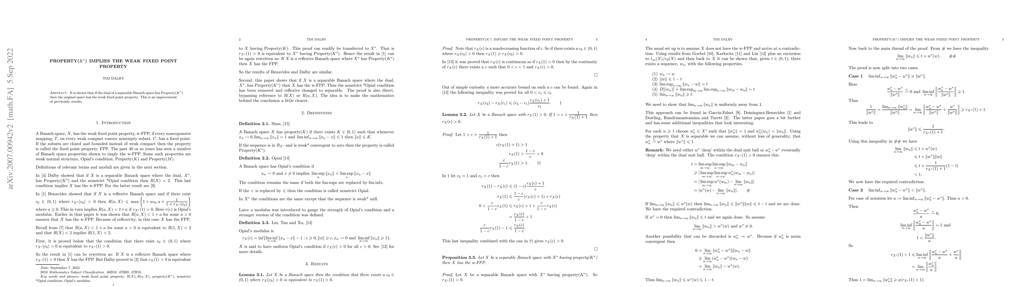 The paper uses a proof technique to show that if the dual of a separable Banach space has Property($K^*$), then the original space has the weak fixed point property (w-FPP). The proof is direct and bypasses reference to $R(X)$ or $R(a,X)$. It introduces Lemmas and Proposition to establish the equivalence and implications.