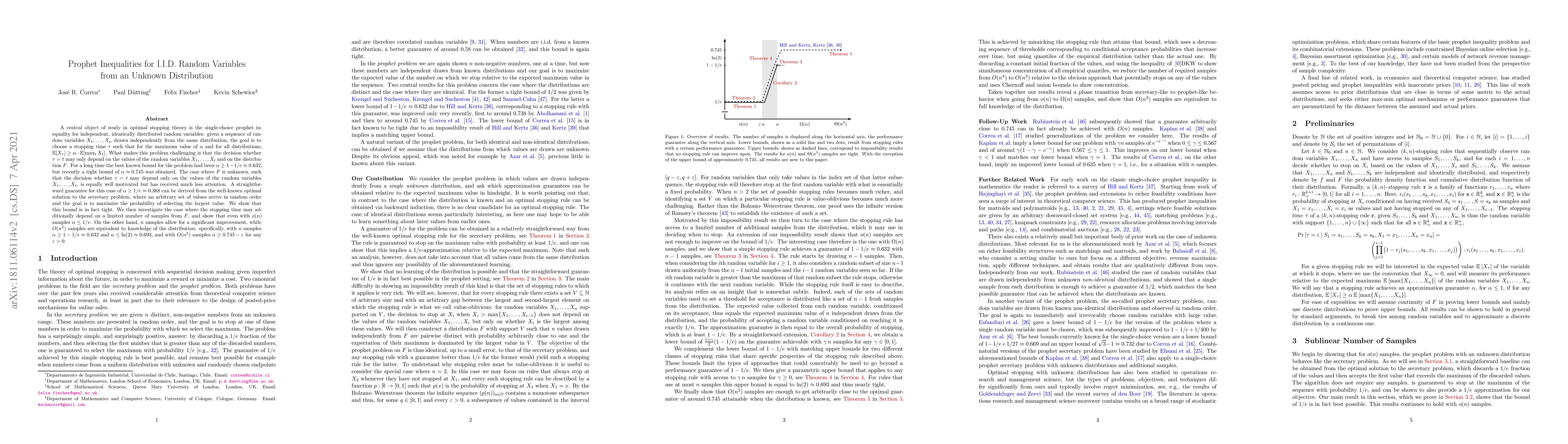 A central object in optimal stopping theory is the single-choice prophet inequality for independent, identically distributed random variables: Given a sequence of random variables $X_1,\dots,X_n$ drawn independently from a distribution $F$, the goal is to choose a stopping time $\tau$ so as to maximize $\alpha$ such that for all distributions $F$ we have $\mathbb{E}[X_\tau] \geq \alpha \cdot \mathbb{E}[\max_tX_t]$. What makes this problem challenging is that the decision whether $\tau=t$ may only depend on the values of the random variables $X_1,\dots,X_t$ and on the distribution $F$. For quite some time the best known bound for the problem was $\alpha\geq1-1/e\approx0.632$ [Hill and Kertz, 1982]. Only recently this bound was improved by Abolhassani et al. [2017], and a tight bound of $\alpha\approx0.745$ was obtained by Correa et al. [2017]. The case where $F$ is unknown, such that the decision whether $\tau=t$ may depend only on the values of the first $t$ random variables but not on $F$, is equally well motivated (e.g., [Azar et al., 2014]) but has received much less attention. A straightforward guarantee for this case of $\alpha\geq1/e\approx0.368$ can be derived from the solution to the secretary problem. Our main result is that this bound is tight. Motivated by this impossibility result we investigate the case where the stopping time may additionally depend on a limited number of samples from~$F$. An extension of our main result shows that even with $o(n)$ samples $\alpha\leq 1/e$, so that the interesting case is the one with $\Omega(n)$ samples. Here we show that $n$ samples allow for a significant improvement over the secretary problem, while $O(n^2)$ samples are equivalent to knowledge of the distribution: specifically, with $n$ samples $\alpha\geq1-1/e\approx0.632$ and $\alpha\leq\ln(2)\approx0.693$, and with $O(n^2)$ samples $\alpha\geq0.745-\epsilon$ for any $\epsilon>0$.