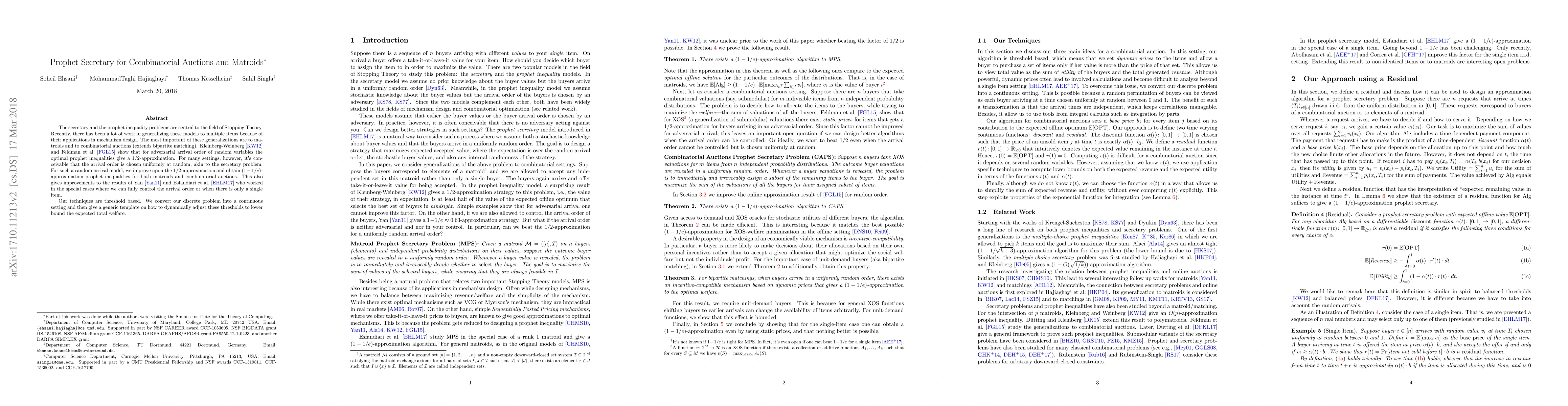 This paper improves the prophet inequalities for combinatorial auctions and matroids under a random arrival model, achieving a $(1-1/e)$-approximation. The authors use threshold-based techniques, converting the problem into a continuous setting and dynamically adjusting thresholds to enhance welfare approximation.