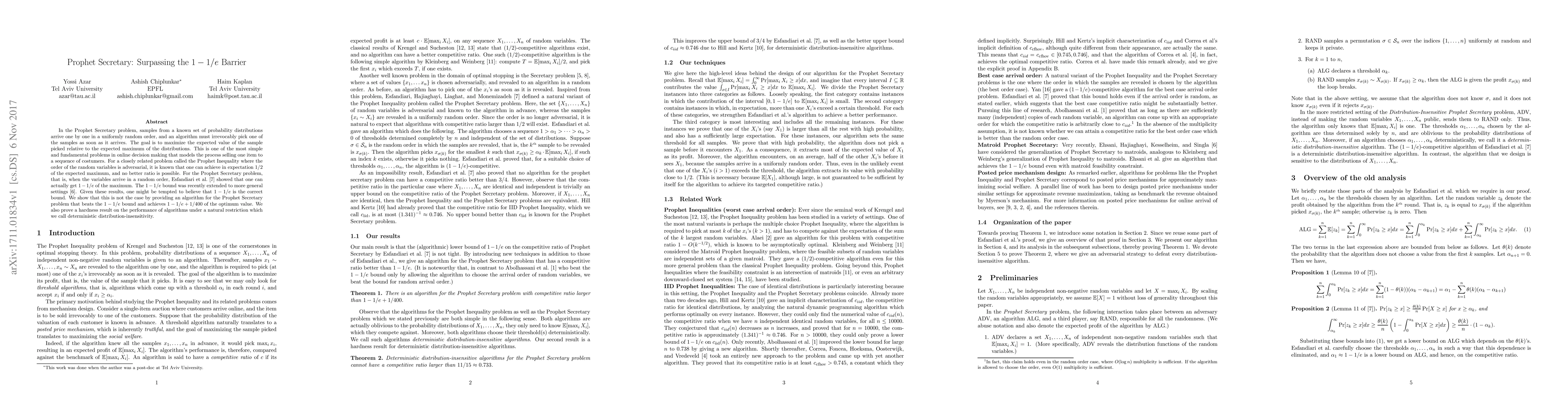 This paper presents an algorithm that surpasses the $1-1/e$ bound for the Prophet Secretary problem, achieving $1-1/e+1/400$ of the optimum value. It also establishes a hardness result for algorithms under the restriction of deterministic distribution-insensitivity.