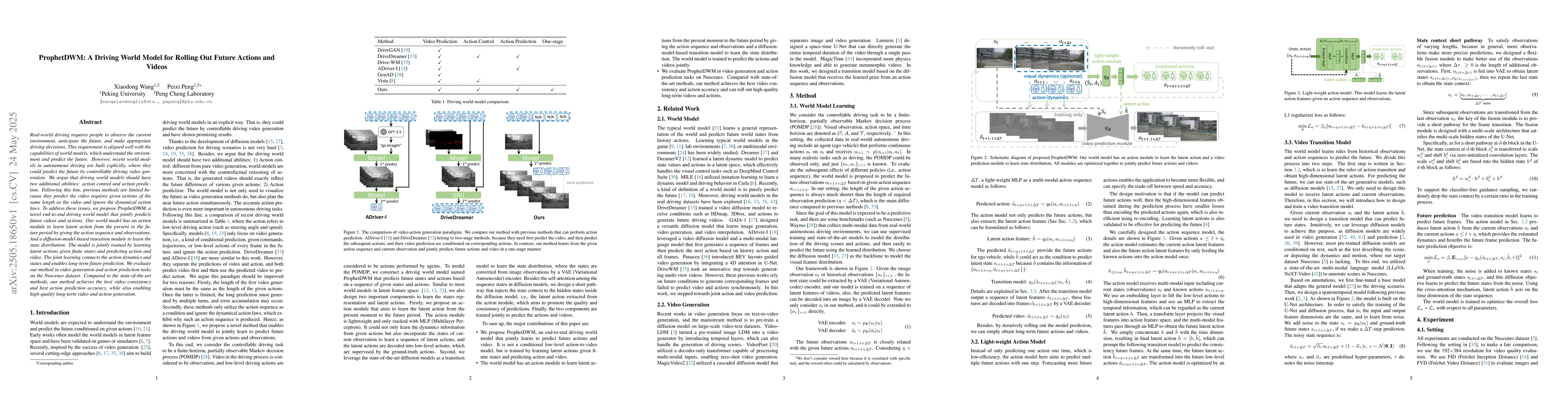 ProphetDWM is a novel driving world model that jointly predicts future videos and actions, achieving best video consistency and action prediction accuracy on the Nuscenes dataset.