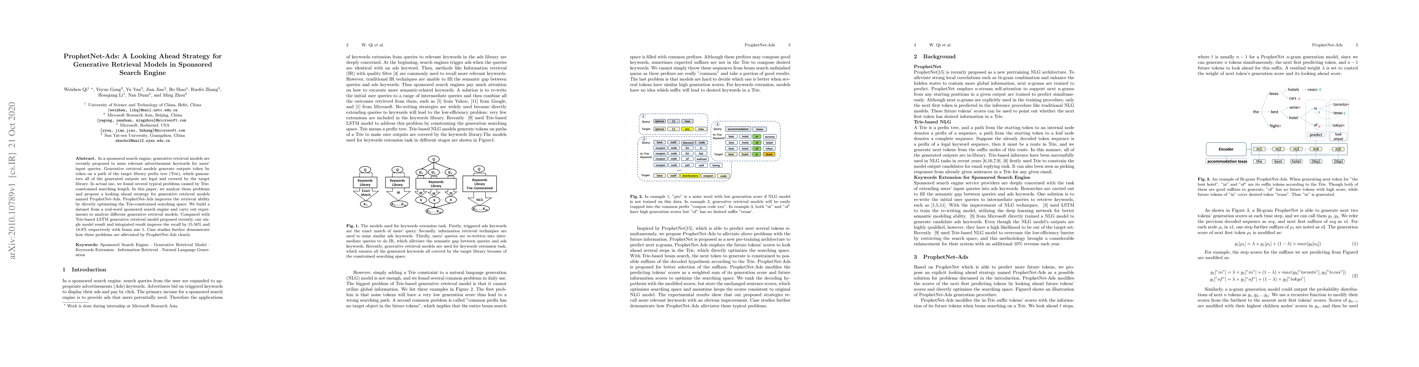 This paper proposes ProphetNet-Ads, a looking ahead strategy to enhance generative retrieval models in sponsored search engines. It addresses issues caused by Trie-constrained searching and improves recall by optimizing the Trie-constrained searching space, achieving a 15.58% improvement in single model recall and 18.8% in integrated results compared to a Trie-based LSTM model.