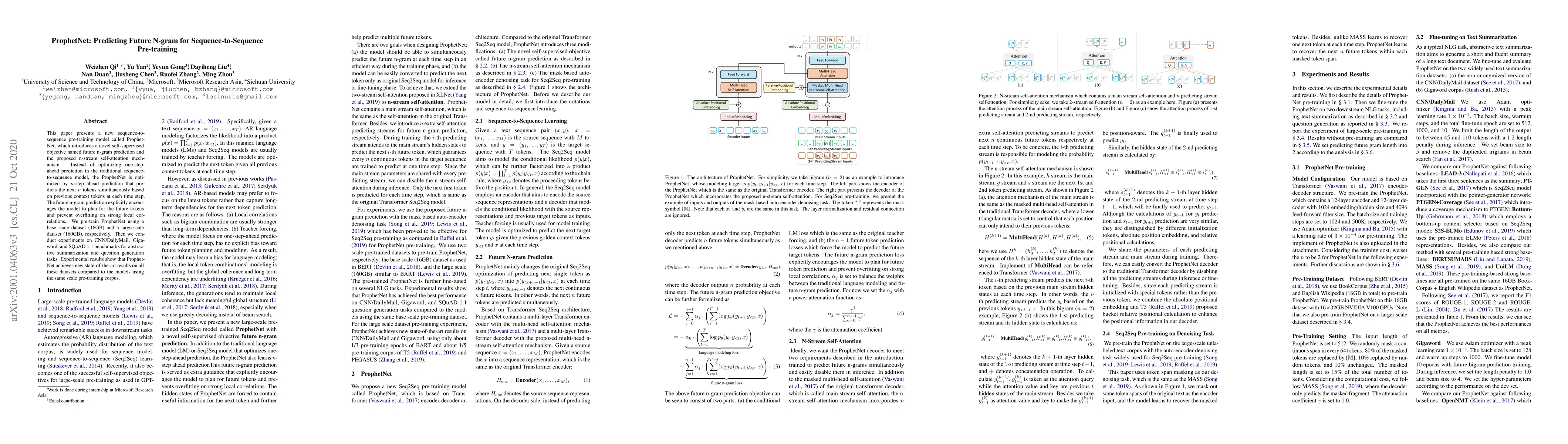 ProphetNet introduces a self-supervised pre-training model for sequence-to-sequence tasks that predicts future n-grams, optimizing n-step ahead token prediction to enhance future context planning. Experiments show it outperforms existing models on summarization and question generation tasks.