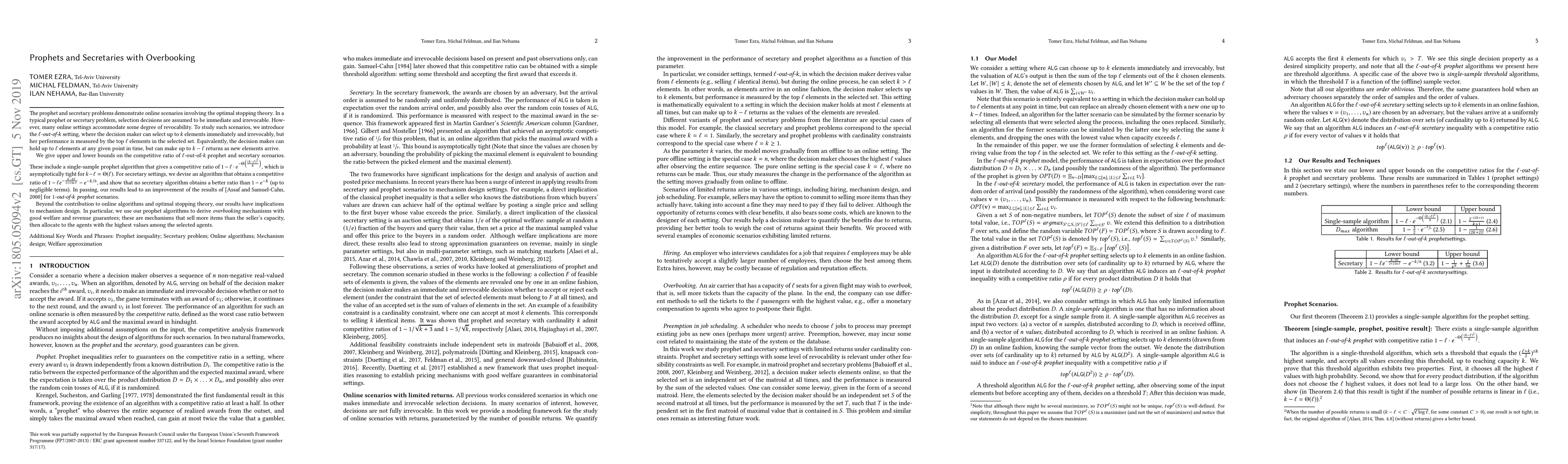 The prophet and secretary problems demonstrate online scenarios involving the optimal stopping theory. In a typical prophet or secretary problem, selection decisions are assumed to be immediate and irrevocable. However, many online settings accommodate some degree of revocability. To study such scenarios, we introduce the $\ell-out-of-k$ setting, where the decision maker can select up to $k$ elements immediately and irrevocably, but her performance is measured by the top $\ell$ elements in the selected set. Equivalently, the decision makes can hold up to $\ell$ elements at any given point in time, but can make up to $k-\ell$ returns as new elements arrive. We give upper and lower bounds on the competitive ratio of $\ell$-out-of-$k$ prophet and secretary scenarios. These include a single-sample prophet algorithm that gives a competitive ratio of $1-\ell\cdot e^{-\Theta\left(\frac{\left(k-\ell\right)^2}{k}\right)}$, which is asymptotically tight for $k-\ell=\Theta(\ell)$. For secretary settings, we devise an algorithm that obtains a competitive ratio of $1-\ell e^{-\frac{k-8\ell}{2+2\ln \ell}} - e^{-k/6}$, and show that no secretary algorithm obtains a better ratio than $1-e^{-k}$ (up to negligible terms). In passing, our results lead to an improvement of the results of Assaf et al. [2000] for $1-out-of-k$ prophet scenarios. Beyond the contribution to online algorithms and optimal stopping theory, our results have implications to mechanism design. In particular, we use our prophet algorithms to derive {\em overbooking} mechanisms with good welfare and revenue guarantees; these are mechanisms that sell more items than the seller's capacity, then allocate to the agents with the highest values among the selected agents.