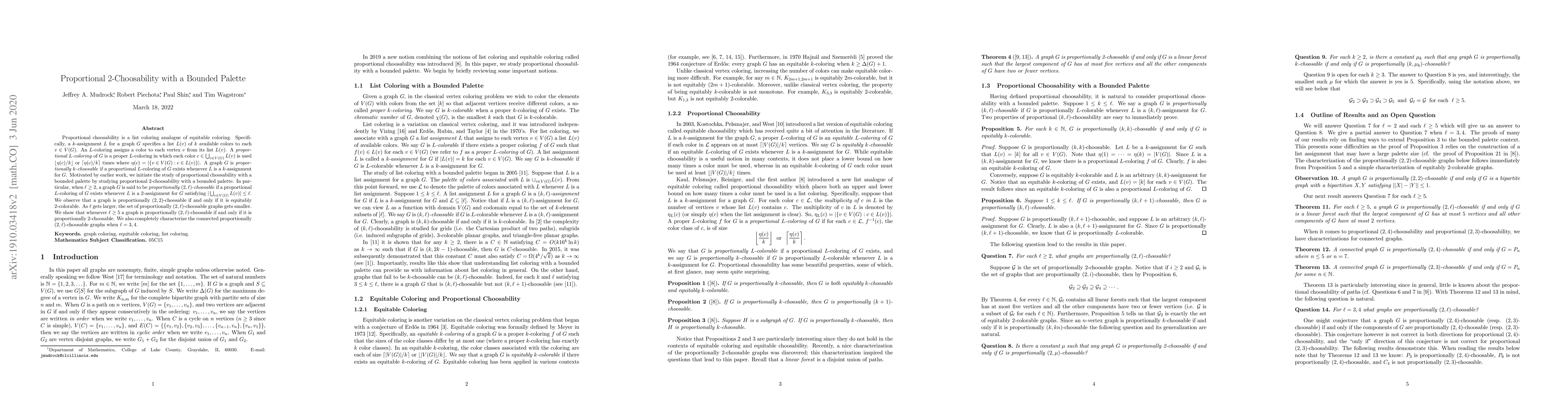 This paper explores proportional 2-choosability with a bounded palette, defining proportionally $(2, \ell)$-choosable graphs where $\ell$ limits the total number of colors available. It finds that proportional $(2,2)$-choosability is equivalent to equitable 2-colorability, and for $\ell \geq 5$, proportional $(2, \ell)$-choosability is equivalent to standard proportional 2-choosability. The study also fully characterizes connected graphs for $\ell = 3,4$.