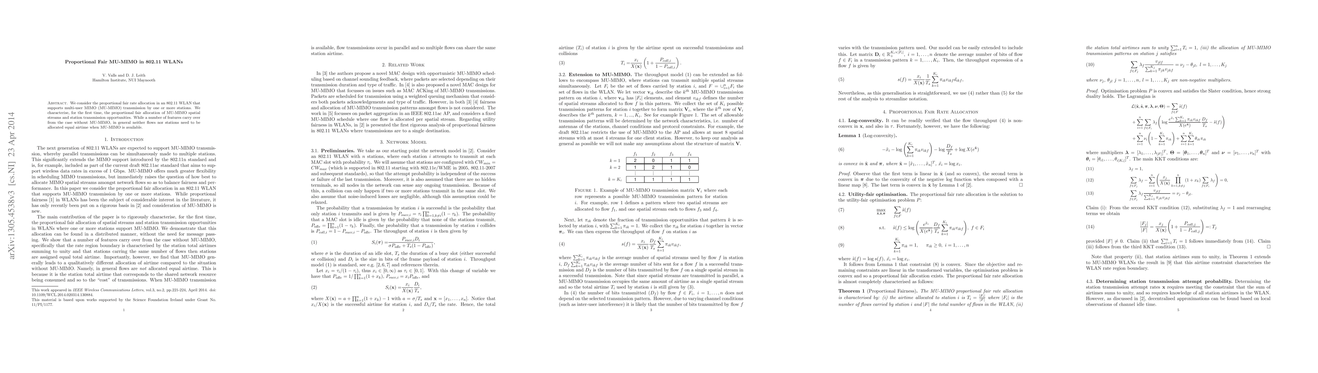 The paper analyzes proportional fair rate allocation in 802.11 WLANs supporting MU-MIMO transmission, characterizing the allocation of MU-MIMO spatial streams and station transmission opportunities for the first time.
