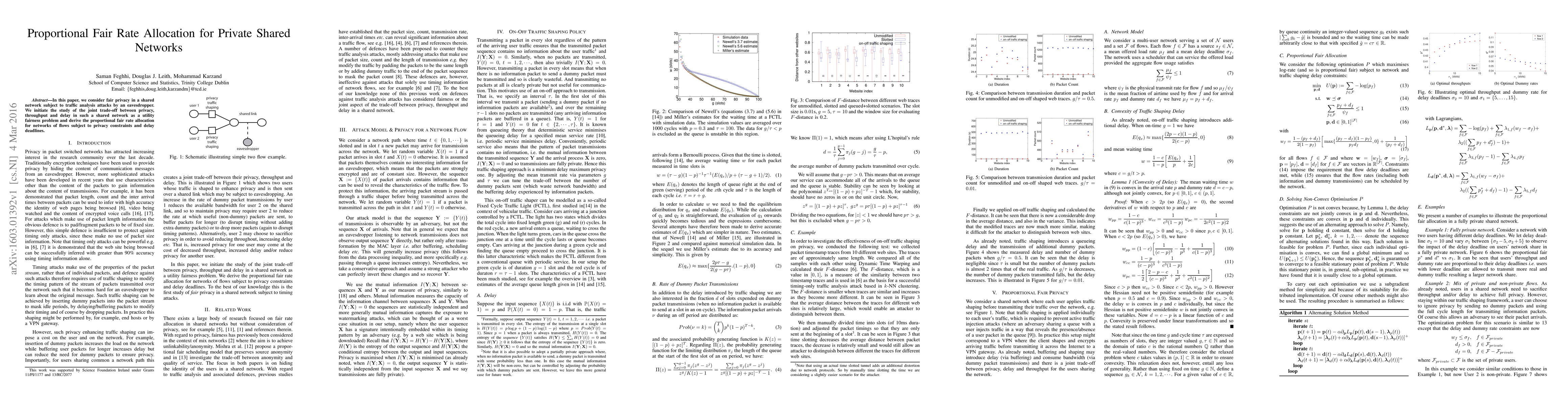 This paper explores fair privacy in shared networks vulnerable to traffic analysis attacks, proposing a proportional fair rate allocation method that balances privacy, throughput, and delay under privacy constraints and delay deadlines. The study introduces a utility fairness problem to manage these trade-offs.