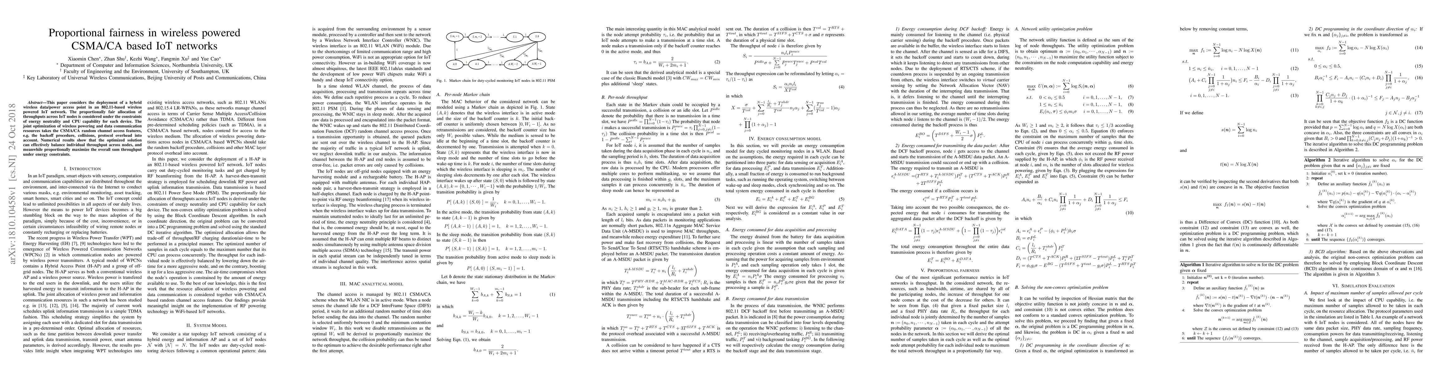 This paper considers the deployment of a hybrid wireless data/power access point in an 802.11-based wireless powered IoT network. The proportionally fair allocation of throughputs across IoT nodes is considered under the constraints of energy neutrality and CPU capability for each device. The joint optimization of wireless powering and data communication resources takes the CSMA/CA random channel access features, e.g. the backoff procedure, collisions, protocol overhead into account. Numerical results show that the optimized solution can effectively balance individual throughput across nodes, and meanwhile proportionally maximize the overall sum throughput under energy constraints.