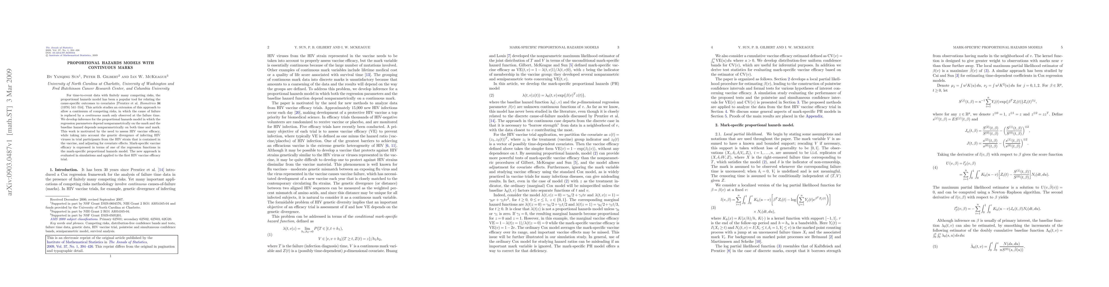 This paper extends the proportional hazards model to accommodate continuous marks representing competing risks, allowing for a continuum of failure causes. The developed model assesses HIV vaccine efficacy by adjusting for genetic divergence and covariate effects, and is evaluated through simulations and applied to an HIV vaccine trial.