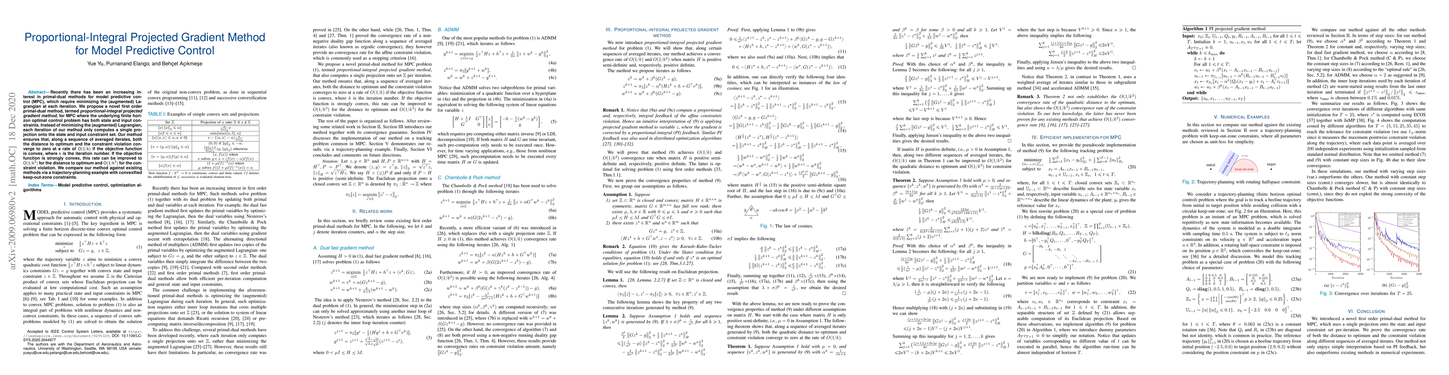 This paper proposes a novel first-order primal-dual method called the proportional-integral projected gradient method for model predictive control, ensuring convergence to the optimal solution and constraint satisfaction. The method achieves convergence rates of \(O(1/k)\) and \(O(1/k^2)\) under convex and strongly convex conditions, respectively.