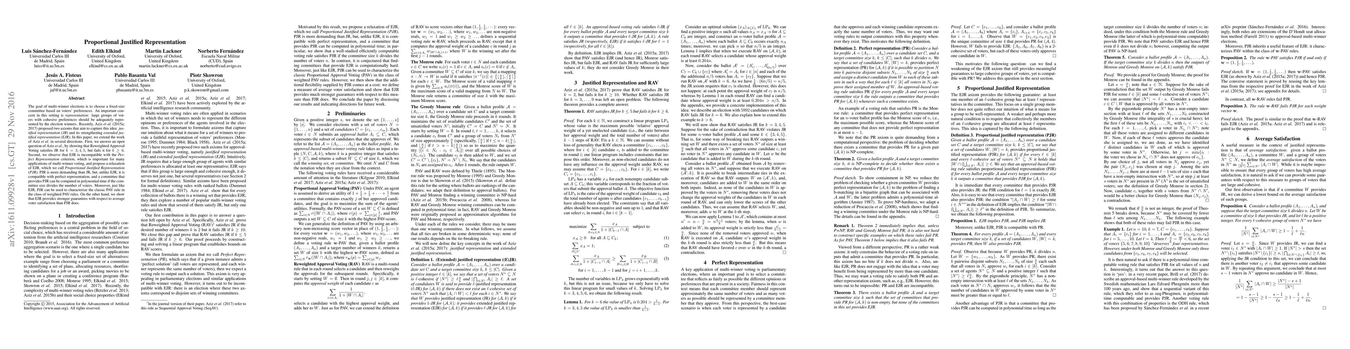 This paper extends the concept of justified representation in multi-winner elections by proposing Proportional Justified Representation (PJR), which is compatible with perfect representation unlike extended justified representation (EJR). It also demonstrates that Reweighted Approval Voting satisfies justified representation for small committee sizes but fails for larger sizes.