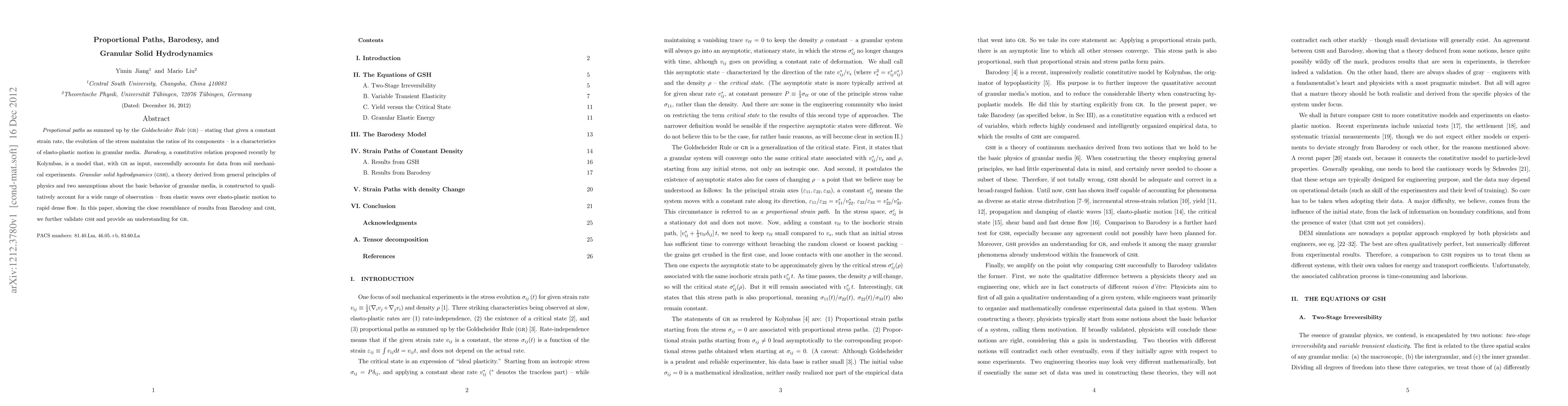 Propotional paths as summed up by the Goldscheider Rule (GR) -- stating that given a constant strain rate, the evolution of the stress maintains the ratios of its components -- is a characteristics of elasto-plastic motion in granular media. Barodesy, a constitutive relation proposed recently by Kolymbas, is a model that, with GR as input, successfully accounts for data from soil mechanical experiments. Granular solid hydrodynamics (GSH), a theory derived from general principles of physics and two assumptions about the basic behavior of granular media, is constructed to qualitatively account for a wide range of observation -- from elastic waves over elasto-plastic motion to rapid dense flow. In this paper, showing the close resemblance of results from Barodesy and GSH, we further validate GSH and provide an understanding for GR.