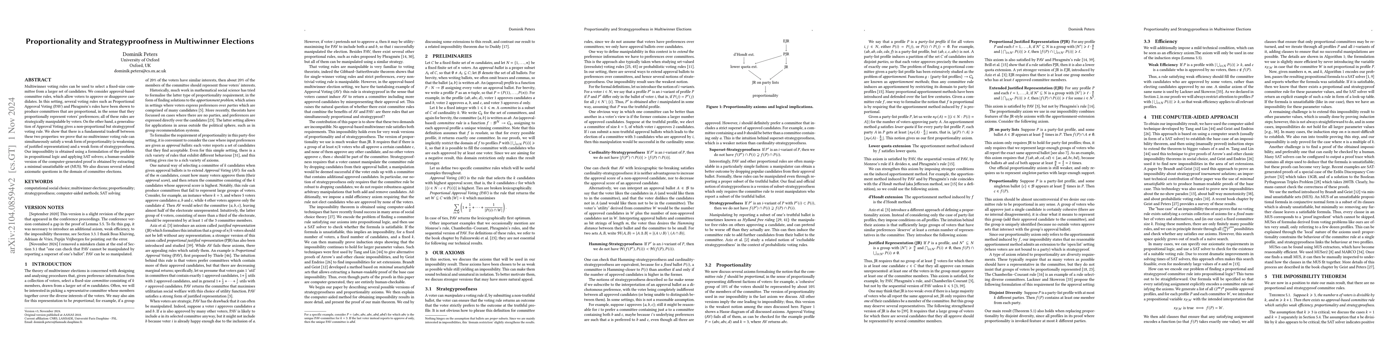 This paper demonstrates an inherent tradeoff between proportionality and strategyproofness in multiwinner elections using approval-based voting rules. It proves that no voting rule can achieve both a weak form of proportionality and a weak form of strategyproofness, employing propositional logic and SAT solvers to establish the impossibility result.