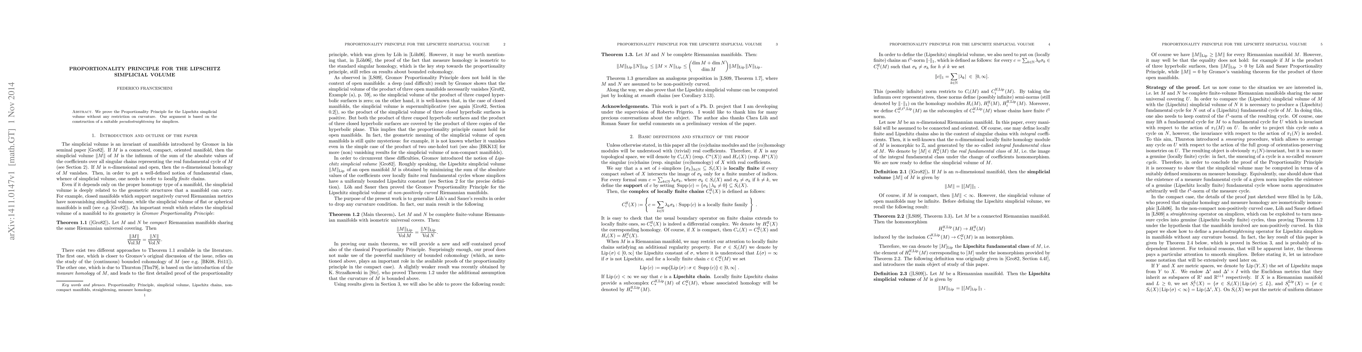 We prove the Proportionality Principle for the Lipschitz simplicial volume without any restriction on curvature. Our argument is based on the construction of a suitable \emph{pseudostraightening} for simplices.