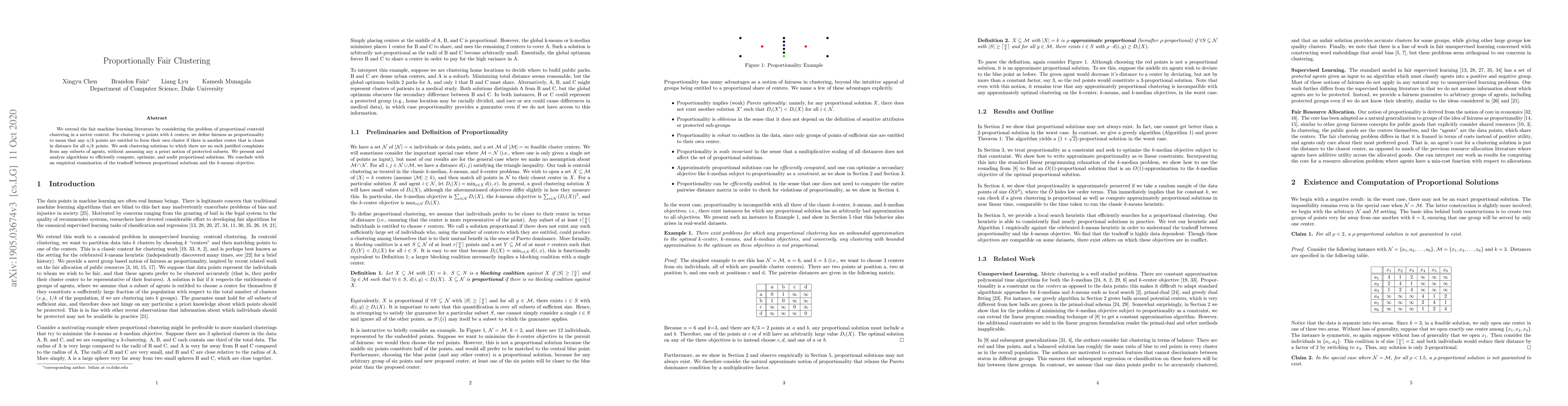 This paper introduces a clustering method called Proportionally Fair Clustering that ensures fairness by allowing subsets of points to form their own cluster if they have another center closer in distance. The research presents algorithms to compute and optimize proportional solutions while minimizing complaints from any subset of agents.