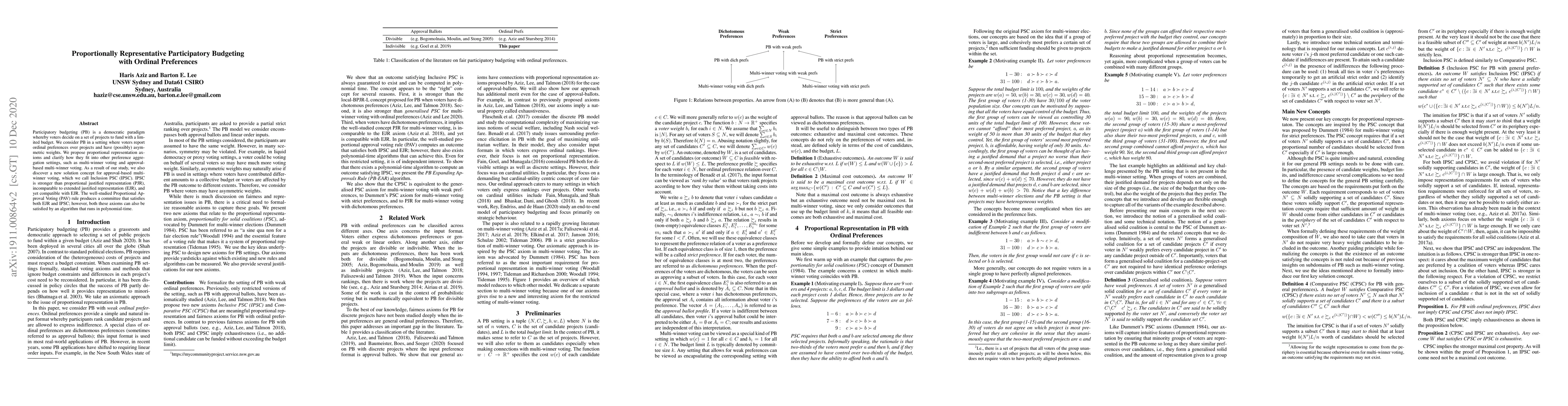 This paper explores participatory budgeting with ordinal preferences and asymmetric weights, proposing proportional representation axioms that extend to multi-winner voting systems. It introduces a new solution concept, Inclusion PSC (IPSC), which is stronger than proportional justified representation (PJR) and compatible with extended justified representation (EJR).