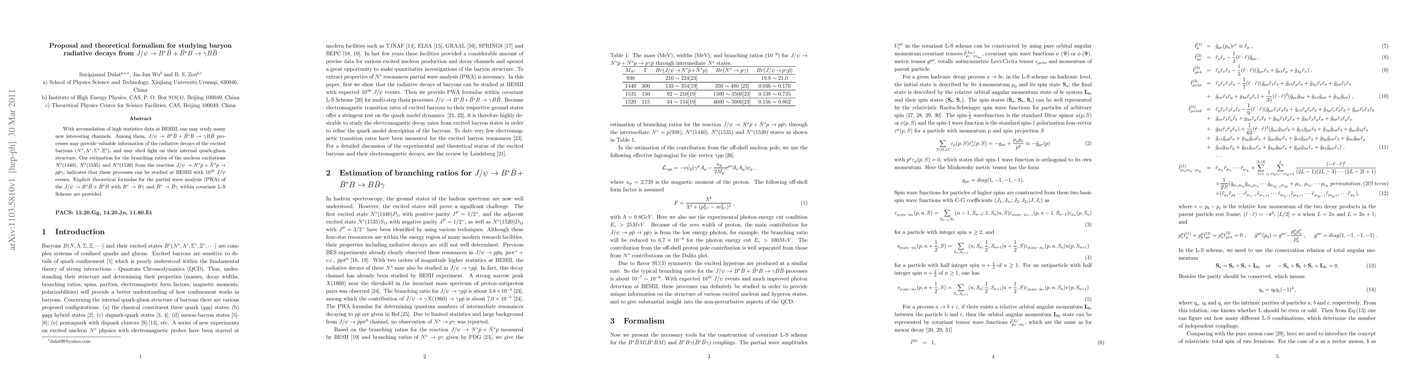 This paper proposes a theoretical framework for studying baryon radiative decays via the J/\psi to B^*\bar B + \bar{B^*}B processes, aiming to extract information on the internal quark-gluon structure of excited baryons. The study estimates that these processes can be investigated at BESIII with sufficient event statistics, providing explicit formulae for partial wave analysis.