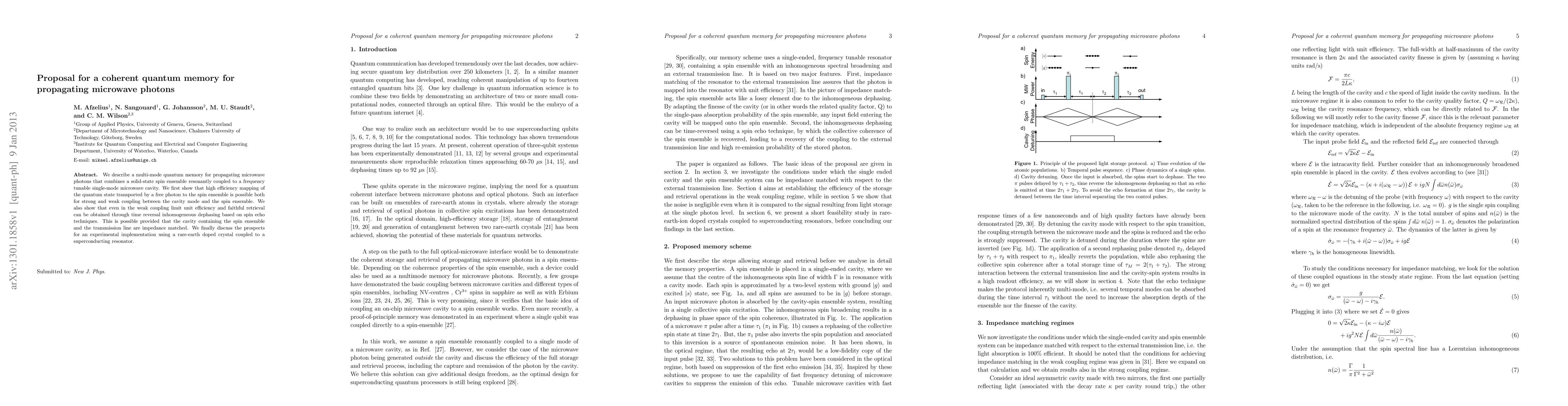 This paper proposes a multi-mode quantum memory for propagating microwave photons using a solid-state spin ensemble coupled to a tunable microwave cavity. The authors demonstrate high-efficiency quantum state mapping and faithful retrieval even in weak coupling scenarios, leveraging spin echo techniques and impedance matching.