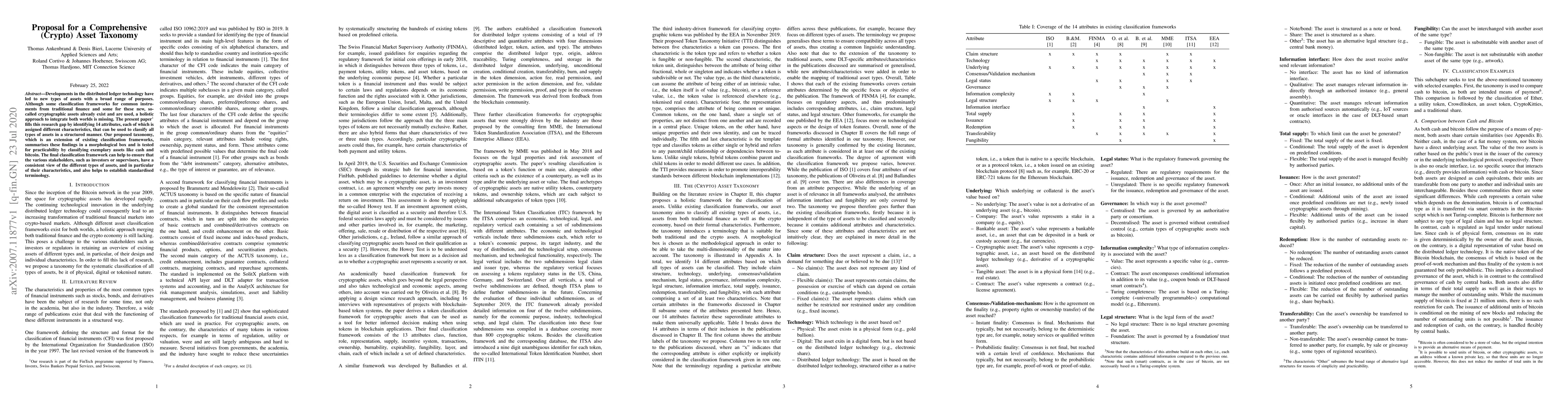 Developments in the distributed ledger technology have led to new types of assets with a broad range of purposes. Although some classification frameworks for common instruments from traditional finance and some for these new, so called cryptographic assets already exist and are used, a holistic approach to integrate both worlds is missing. The present paper fills this research gap by identifying 14 attributes, each of which is assigned different characteristics, that can be used to classify all types of assets in a structured manner. Our proposed taxonomy which is an extension of existing classification frameworks, summarises these findings in a morphological box and is tested for practicability by classifying exemplary assets like cash and bitcoin. The final classification framework can help to ensure that the various stakeholders, such as investors or supervisors, have a consistent view of the different types of assets, and in particular of their characteristics, and also helps to establish standardised terminology.