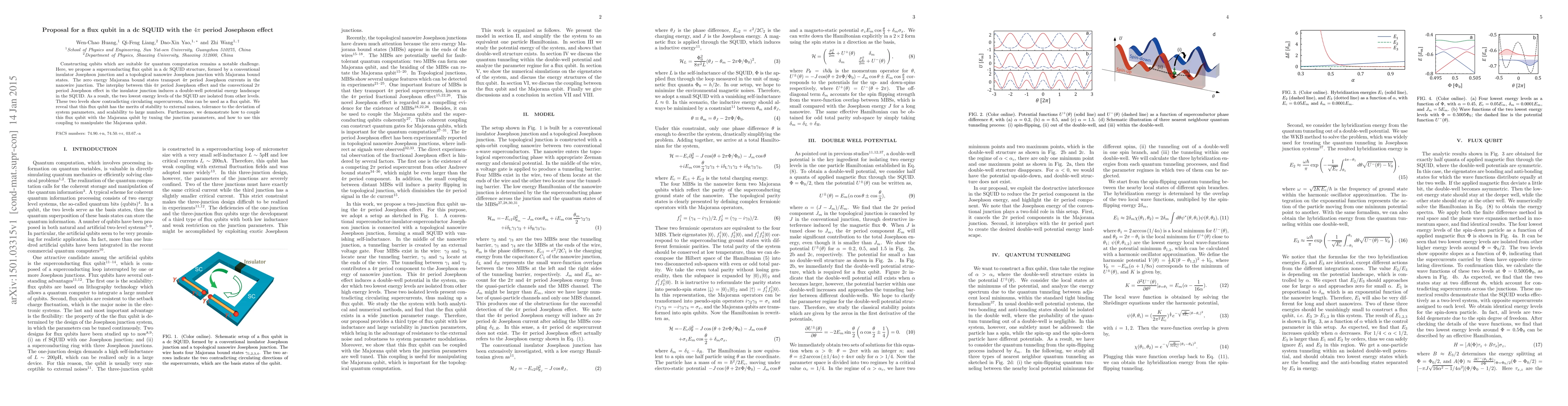 Constructing qubits which are suitable for quantum computation remains a notable challenge. Here, we propose a superconducting flux qubit in a dc SQUID structure, formed by a conventional insulator Josephson junction and a topological nanowire Josephson junction with Majorana bound states. The zero energy Majorana bound states transport $4\pi$ period Josephson currents in the nanowire junction. The interplay between this $4\pi$ period Josephson effect and the convectional $2\pi$ period Josephson effect in the insulator junction induces a double-well potential energy landscape in the SQUID. As a result, the two lowest energy levels of the SQUID are isolated from other levels. These two levels show contradicting circulating supercurrents, thus can be used as a flux qubit. We reveal that this flux qubit has the merits of stability to external noises, tolerance to the deviation of system parameters, and scalability to large numbers. Furthermore, we demonstrate how to couple this flux qubit with the Majorana qubit by tuning the junction parameters, and how to use this coupling to manipulate the Majorana qubit.
