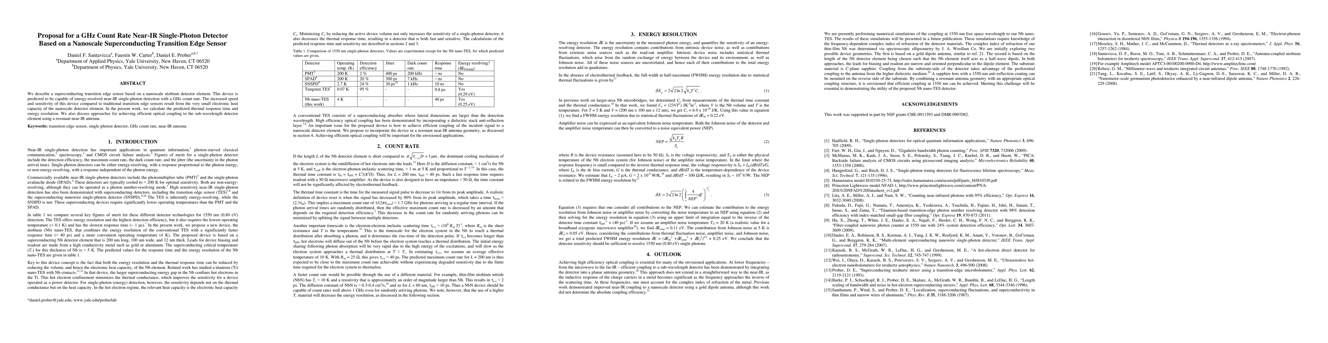 This paper proposes a nanoscale superconducting transition edge sensor for near-IR single-photon detection with GHz count rates, leveraging the small electronic heat capacity of the niobium detector. The device is expected to outperform traditional sensors in speed and sensitivity, with calculated thermal response times and energy resolution.