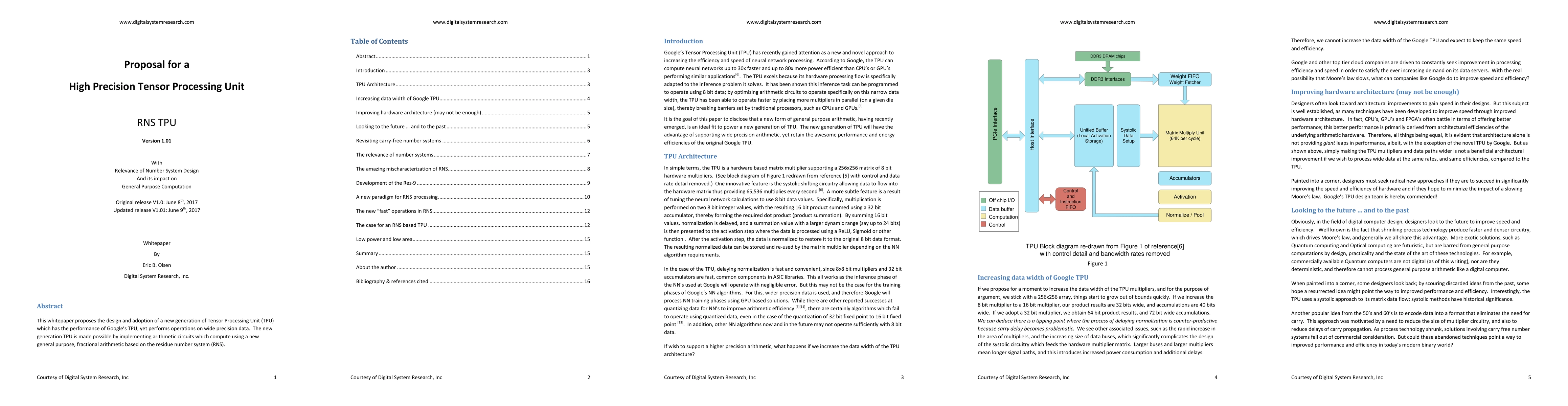 This whitepaper proposes the design and adoption of a new generation of Tensor Processing Unit which has the performance of Google's TPU, yet performs operations on wide precision data. The new generation TPU is made possible by implementing arithmetic circuits which compute using a new general purpose, fractional arithmetic based on the residue number system.