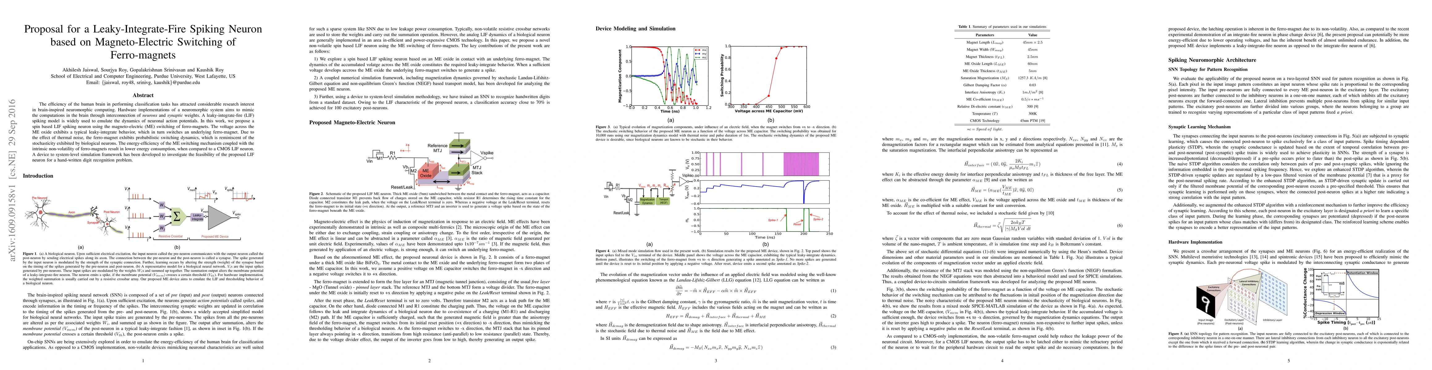 This paper proposes a spin-based leaky-integrate-fire (LIF) spiking neuron utilizing magneto-electric switching of ferro-magnets, aiming for energy-efficient neuromorphic computing. The probabilistic switching dynamics of ferro-magnets mimic biological neurons, and simulations show its potential for hand-written digit recognition.